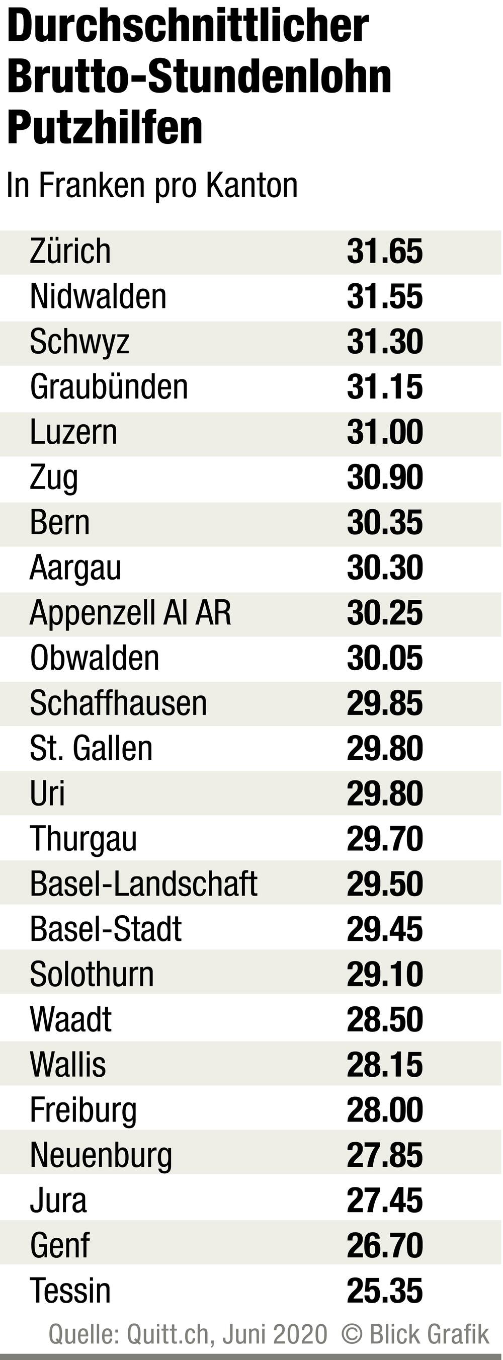 Die Kunden von Proper Job zahlen für die Putzfrauen ab 41.75 Franken die Stunde. Die Putzkräfte erhalten 29.40 Franken ausbezahlt. Der Rest geht weg für Sozialabgaben und eine Administrations- und Risikopauschale, die auch krankheitsbedingte Ausfälle abdeckt. Das ist über den Brutto-Durchschnittsstundenlöhnen, die je nach Kanton zwischen 25.35 und 31.65 Franken schwanken.